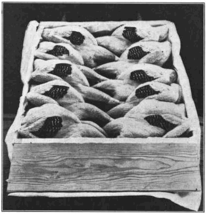 Boxes are greatly preferred by the trade and by organized pools. In box packing, the single-layer pack of 6 to 14 birds, depending on their size, is preferred. The boxes are usually large enough to hold from 10 to 12 medium-sized birds (fig. 23).