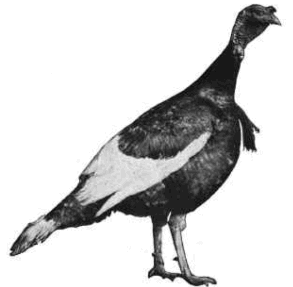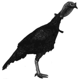 The Black (fig. 6), known in England as the Norfolk turkey, is lustrous greenish black in all sections of the plumage. Objectionable white tipping in the feathers of young turkeys of this variety often disappears after the first molt. Any variation from the solid black color should be carefully avoided in breeding this variety. The shanks and toes should be pink in mature birds and almost black in young birds.