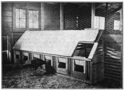 Until a few years ago breeding flocks were ordinarily allowed free range throughout the breeding and laying season (fig. 8). This practice often gives unsatisfactory results because the nests cannot be found readily and therefore the eggs cannot be gathered daily. Many breeding flocks are now kept in good-sized breeding pens or enclosures with nests conveniently located inside or outside the roosting shed (fig. 9). For a pen of 12 to 18 birds a yard of 10 to 15 square rods is large enough. Frequently an orchard is very satisfactory. A hog-proof fence about 6 feet high will confine the turkeys; they are not likely to fly over the fence, because they cannot rest on the top wire. Fences should be tightly stretched and should be dog-proof, because dogs and coyotes are very destructive in turkey flocks. Solid-top fences, gates, and buildings less than 9 feet high should be topped with strips of poultry fence 3 feet wide to prevent turkeys from perching on them. If turkey hens persist in flying over the fence the flight feathers of one wing may be cut, but the wing of a breeding male should never be clipped, as the clipping may interfere with mating.