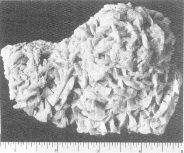 With the above information in mind, one may proceed with certainty to identify a layer of dolomite from a quarry or hillside, or a crystal of it in a hand specimen. First, determine that it is scratched readily with a knife blade or iron nail. Anything too hard to be scratched by steel is neither calcite nor dolomite. Second, scrape a small mound of powder on the lump specimens. Third, apply one or two drops of cold dilute acid to the lump near the powder and allow the acid to run into the powder. If the lump effervesces freely the specimen is calcite mineral or limestone rock. If the lump does not effervesce freely but the powder does, it is dolomite mineral or dolomite rock, dolomitic limestone. If neither lump nor powder effervesce it is neither calcite (ordinary limestone) nor dolomite (dolomitic limestone). In the latter case, it may be gypsum, barite, Shale, weathered chert, clay, or fire clay, or other rock.