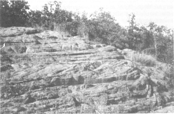 The shales of Missouri were formed from deposits of mud that settled out in sea water which in the past covered this state. Fossil remains of sea-living organisms which are preserved in the shale give evidence of the marine conditions once existent here. Like the muds that are accumulating along the Atlantic coast and in the Gulf of Mexico, where the Mississippi River is discharging its load of silt and clay, so did mud form layers on the bottom of geologically ancient interior seas. In some cases sand was later washed in and covered the mud; in other cases limestone-forming material (like off the coast of Florida today) was deposited on top of the mud. The weight of the overlying beds and the slow movement which raised the sea bottom up to land squeezed out the excess water, compressed and compacted the muds into thin layers, and brought about the shale rock which is exposed to us today.