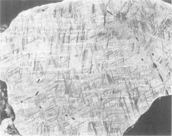 The polished and acid-etched surface of an iron meteorite. Shows the Widmanstatten figures characteristic of iron meteorites. (Photo courtesy of American Museum of Natural History, New York).