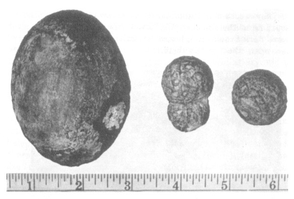 Concretions. Dark, limy concretion at left and brassy pyrite at center and right. Note the inter-grown pair in center.