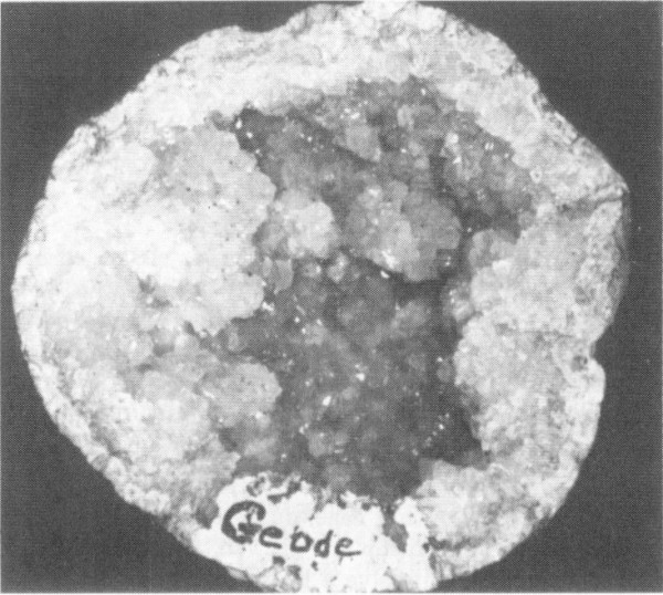 A geode is usually a hollow, more or less spherical or ball-shaped shell of mineral and crystal growth which has formed within surrounding rock. Missouri geodes commonly vary in size from hickory nuts 68 to small watermelons, although neither direction of variation is limited. They weather out abundantly at several localities in northeast Missouri from the so-called Warsaw formation, a limy shale. Here they are dark brown, rough and irregular on the outside, but where broken open show many brilliant, glistening faces of intergrown quartz crystals. Less frequently calcite, chalcedony, kaolinite, and rarely millerite (nickel sulphide) may occur in Missouri geodes.