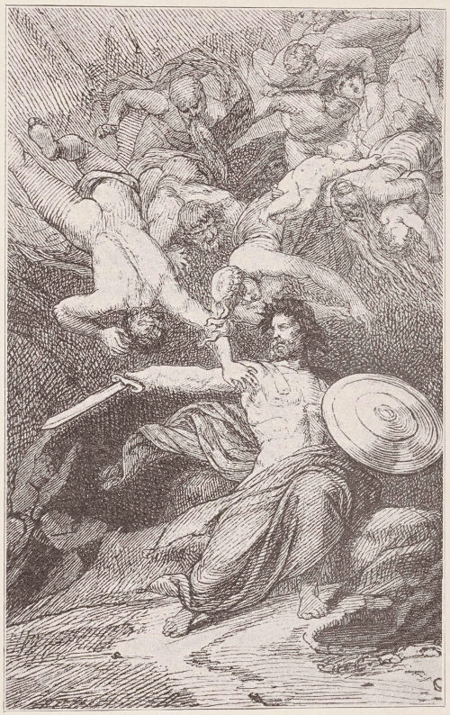 When the suitors saw that Ulysses and Telemachus were left alone they took fresh courage, and it would have gone hard with the two against the combined onset of their foes, had not Athene in Mentor’s form entered at the critical moment armed from head to foot and thrown back the nearest ones with a powerful blow of her shield.