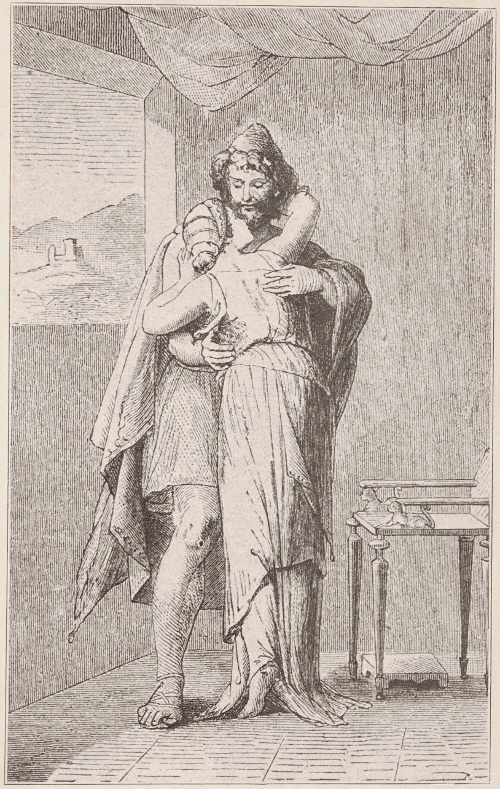 “Indeed it is true,” answered the hero. “He has the hands, the feet, the eyes, and hair of Ulysses. And just now while I was speaking of our old friend, the hot tears sprang from the youth’s lids and he hid his face in the folds of his purple mantle.”