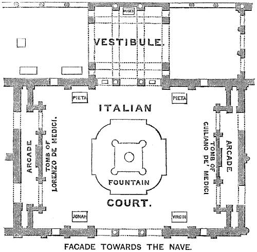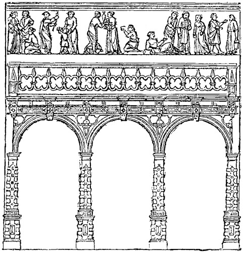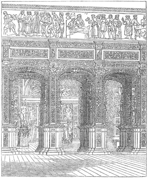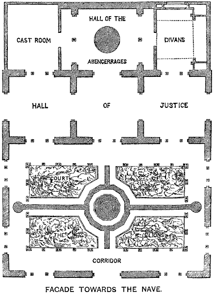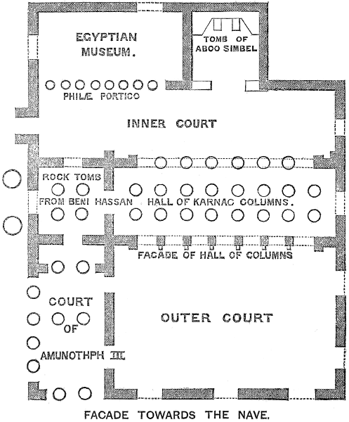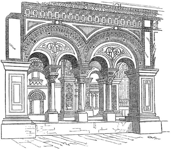 Pirro Ligorio, a Neapolitan architect, erected the villa Pia, 1570, for Pope Pius V. It was built in imitation of the houses of the ancients, whose architecture he had particularly studied. Mazois, whose large work on Pompeii has formed, as it were, the basis of almost all Pompeian studies, wrote an elaborate essay on the palaces of the ancient Romans, under the title “Le Palais de Scaurus.” In this all the descriptions of ancient authors were supposed to be comprised. His work, however, was confined to the pen; and it is to be regretted that Mazois did not undertake an architectural reproduction, as an actual copy of one of the houses he explored whilst they were comparatively perfect, and for which he was so thoroughly qualified. Only one undertaking of this kind has preceded the Pompeian Court at Sydenham. It was prompted by the taste of a monarch, remarkable for his interest in the fine arts of all nations and all ages. The ex-king of Bavaria had a villa built at Aschaffenburg, which was the complete restoration of an ancient Roman house found at Pompeii. It was erected by the celebrated architect, Gärtner, and is an exact copy of the House of the Dioscuri.