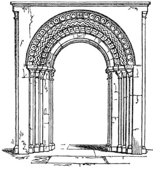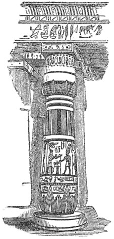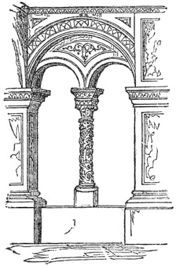 The roof of the ambulatory is panelled and decorated according to the prevailing style of the lighter coloured ceilings at Pompeii. The devices are formed of very thin lines of the brightest colours upon white. The Ionic capitals of the columns are from the Basilica. The shafts of the columns are not fluted at the lower part, the remaining unfluted surface, together with the mouldings upon the base, are painted bright red. This is a Pompeian peculiarity. Red is a prevailing colour at Pompeii, but in the House of the Surgical Instruments, the lower part of the columns was blue, a dwarf wall between them being painted red. (Gell, Pompeiana, first series, pl. 25, p. 170.)