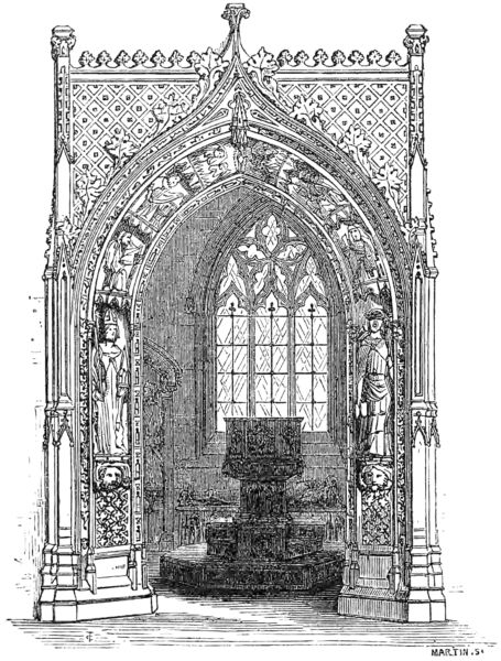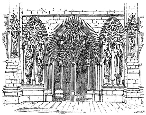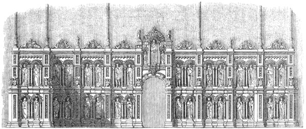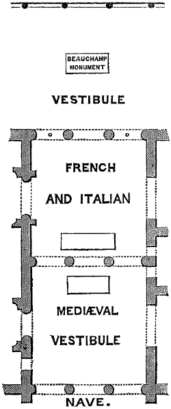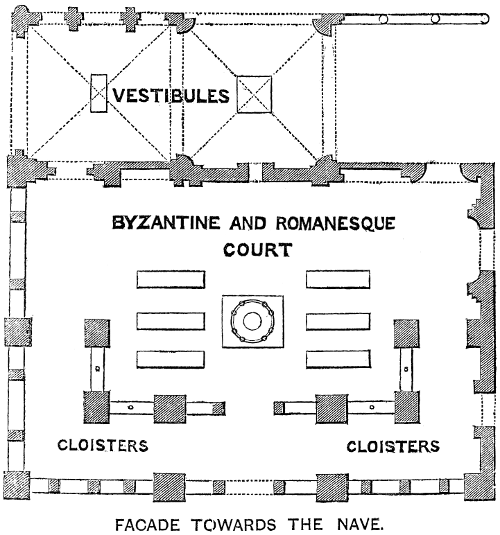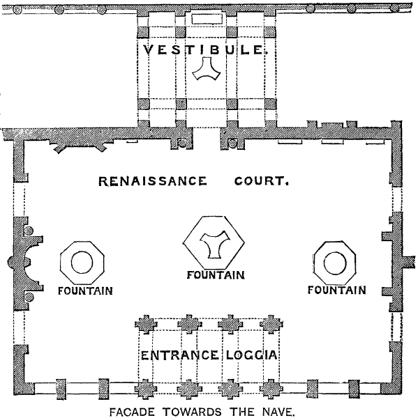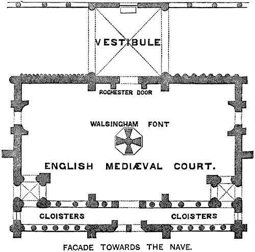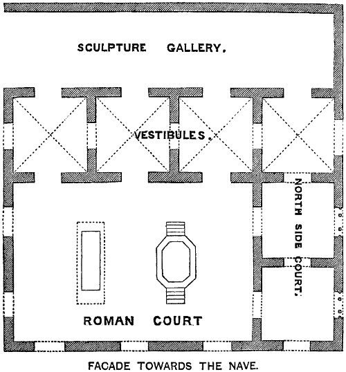 In the Atrium are placed two handsome marble benches, such as the clients might have sat upon whilst waiting for audience with their patron. The ends, which are elaborately carved, have been copied from an original model in the Vatican Museum, and the whole has been presented to the Crystal Palace Company by the London Marble Working Company, through their secretary, Mr. Clare.