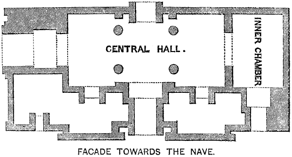 18. Ambulatory, Ambulatio, also called Porticus by the Romans, and Stoa by the Greeks, is a colonnade on four sides, very like the cloisters of our cathedrals. The view looking through the fauces is bounded by a small shrine or chapel, called the Lararium. It is a niche raised on a pedestal, flanked by pilasters, and surmounted by a pediment. Within this were kept the Lares, the sacred household gods, that accompanied the inhabitants in their flight. No figures of this sort have ever been found in such places at Pompeii, although many representations of them remain depicted on the walls. They were generally represented as young men in short girt tunics, crowned and holding the drinking horn in one hand. (See Milman’s Horace, p. 168.) Their appearance was first ascertained by an inscription over the sculpture of an altar formerly in the Villa Medici, and now at Florence; a similar altar is in the Vatican, both inscribed LARIBVS AVGVSTIS. (See Galleria di Firenze, pl. 144 of statue, &c.; Mus. Pio. Clem., vol. iv., tav. 45; and Guattani Mon. Ined, vol. ii.; Maggio, 1785). The Lares presided especially over the domestic hearth. The cornice and entablature of Lararium are taken from the funeral Triclinium[V-59] at Pompeii. The wall behind is a rich Pompeian red, with a yellow ornament, forming a panel on it, beautifully painted.