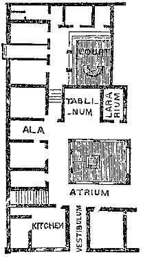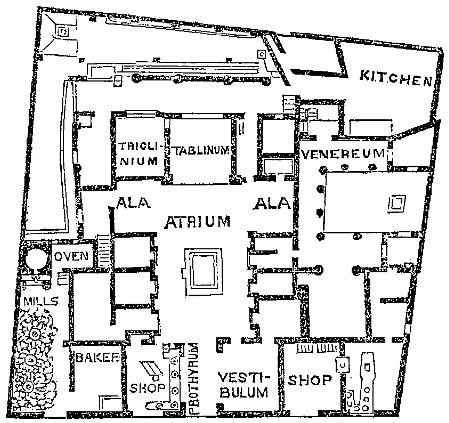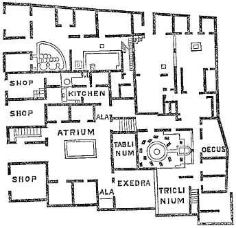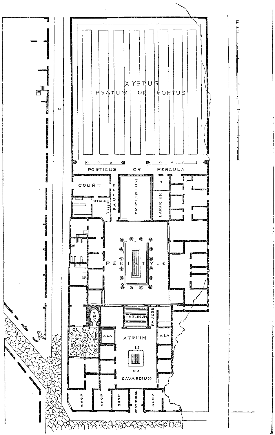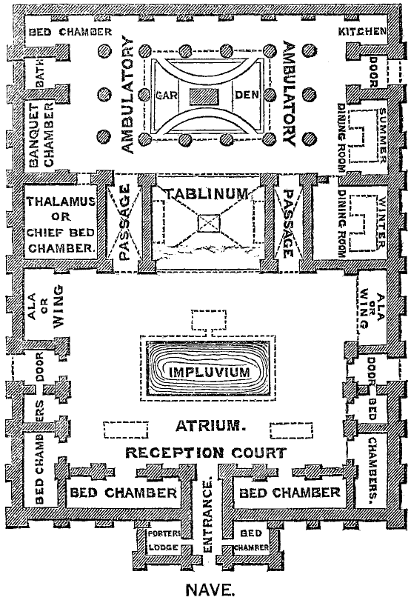 Thus, then, we have completed the gíro of the Pompeian house. The ancients, although they have provided the graceful salutation for comers on their threshold in the word SALVE, do not afford the corresponding word VALE to “speed the parting guest.” Their manes, probably gratified by the interest now manifested in these monuments of their habits, requirements, and enjoyments, desire us to linger within these fairy walls, and to indulge in the thoughts of those who would, ages ago, have found nothing strange and nothing amiss here, excepting the appearance of the thronging visitors, whose costume and manners could never have been anticipated. The house, as we see it, is really a house such as the excavations might reveal. We have already shown that every part has its prototype at Pompeii.