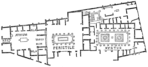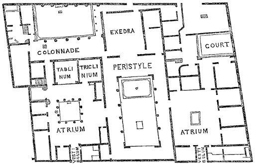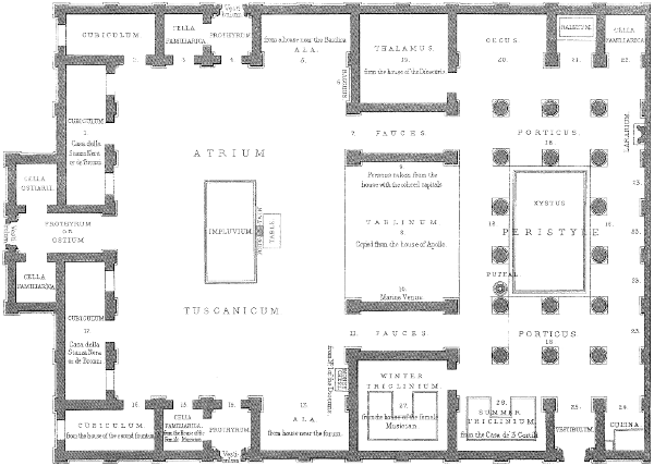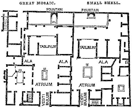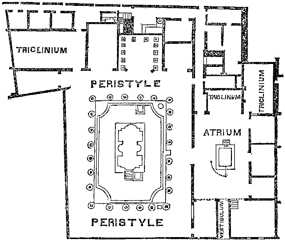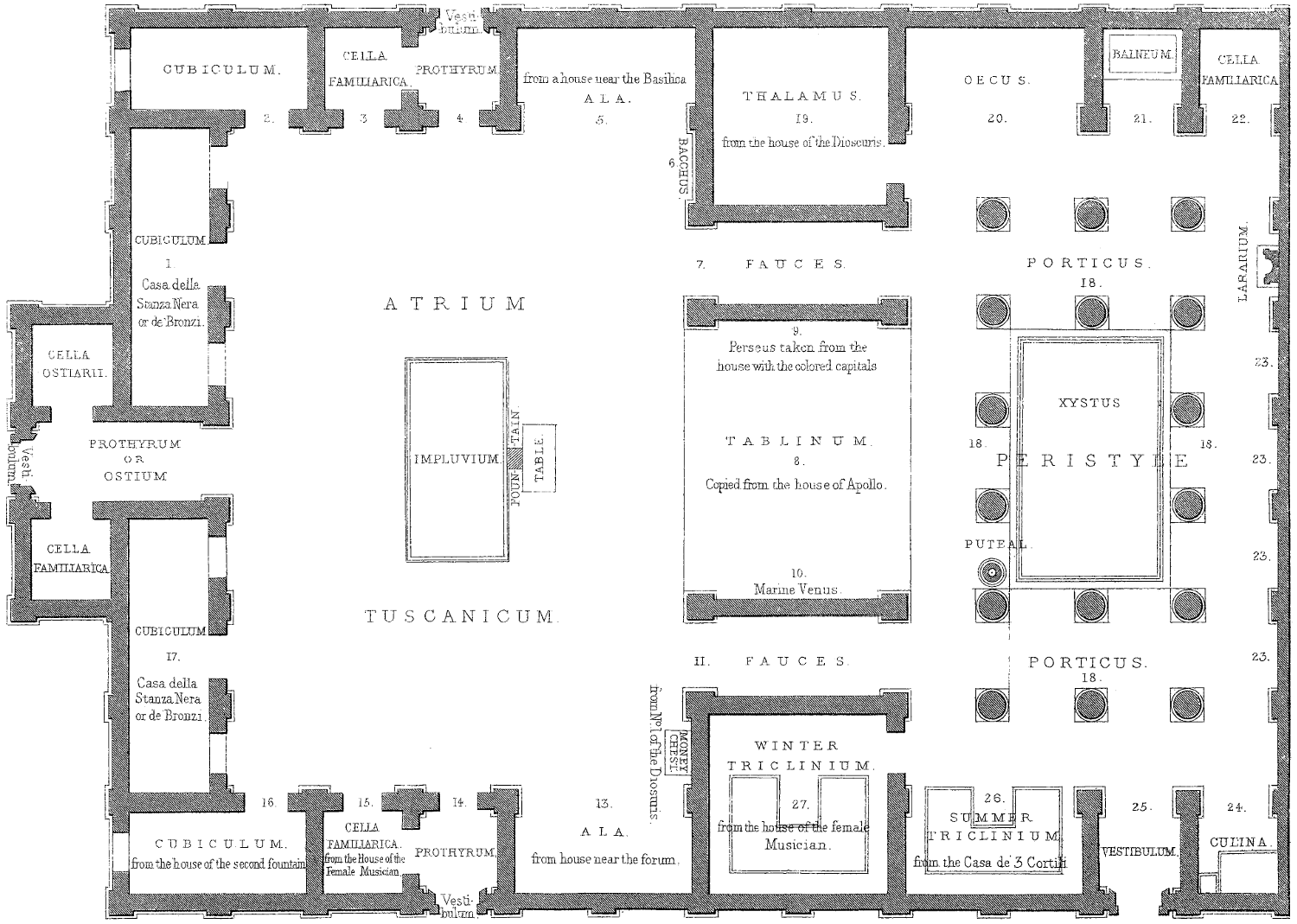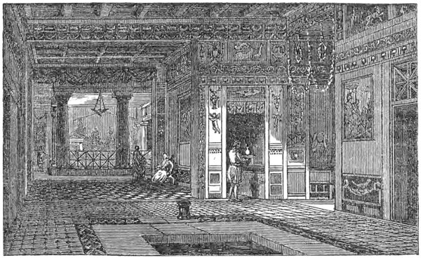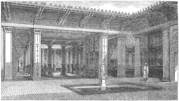 The visitor to Pompeii is but too frequently disappointed at the crumbling condition of the disentombed city; and the majority take little trouble to trace the origin of this first and unfavourable impression. They do not reflect upon the relation between different portions of the ruins, the use or particular object originally served, the custom that produced it, or the former appearance of the details in the harmony of their original arrangement, with the groups of gaily attired inhabitants giving animation to the scene. Like the greater portion of the curious who throng the Elgin Saloon of the British Museum, for the purpose of taking a peep at the mutilated fragments of the marbles contained within its walls, such visitors to Pompeii look for excellencies that do not exist, and a harmony incompatible with the actual condition of the remains; and, discontented at finding things in opposition to their own conceptions, they depart with imperfect and even prejudiced ideas of what they really have beheld. Few arrive at Pompeii with even a general[V-73] idea of the appearance of an ancient Roman house, and are thus incapable of judging of the actual importance of the crumbling remains of the buried cities.