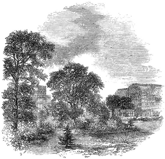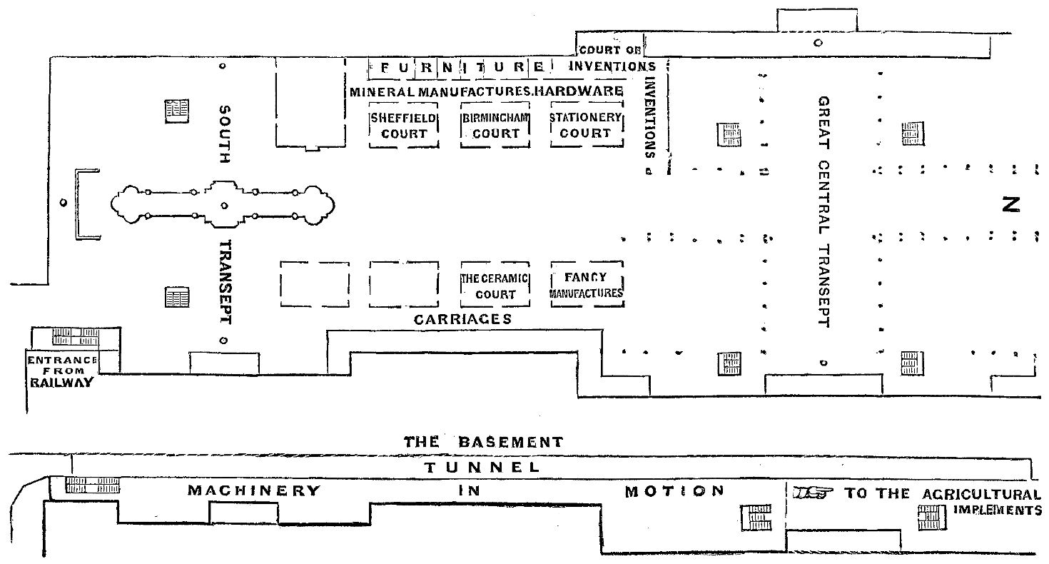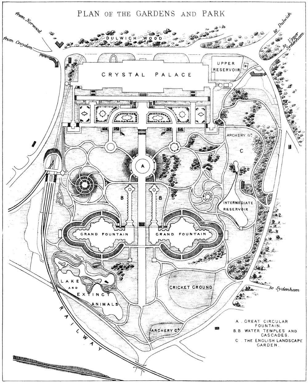 The shortest route from London, by carriage, will be found marked on the accompanying map. The ordinary entrances from the road are at the South and Central Transepts. Entrances are also provided opposite Sydenham Church, and at the bottom of the Park, below the Grand Lake and Extinct Animals.