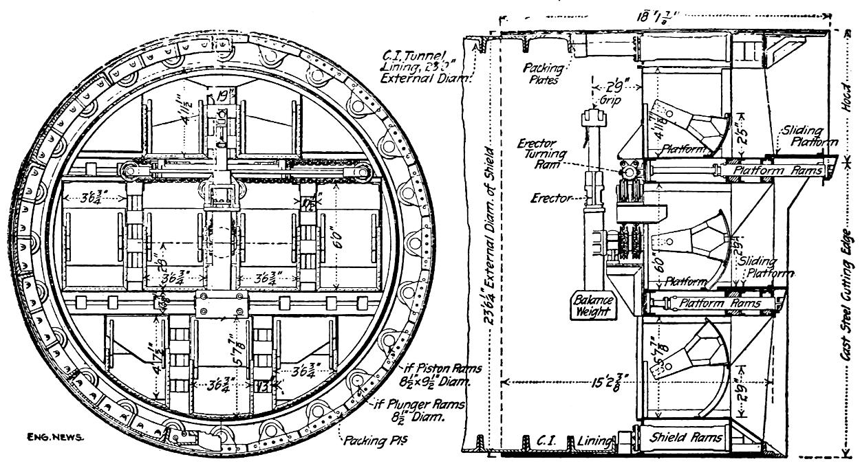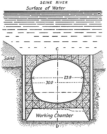 The Habas tunnel through quicksand, between Dax and Ramoux, France, cost $118.50 per lin. ft. The cost of the Boston subway was $342.40 per lin. ft. The Severn and Mersey tunnels, constructed through rock under water, cost respectively $208.38 and $263 per lin. ft. The First Thames Tunnel, driven by Brunel’s shield, cost $1661.66 per lin. ft. The Hudson River and St. Clair River tunnels, excavated through soft ground by means of shields and compressed air, cost respectively $305 and $315 per lin. ft. The Blackwall double-track tunnel under the River Thames, which is the largest tunnel ever built by the shield system, cost $600 per lin. ft.