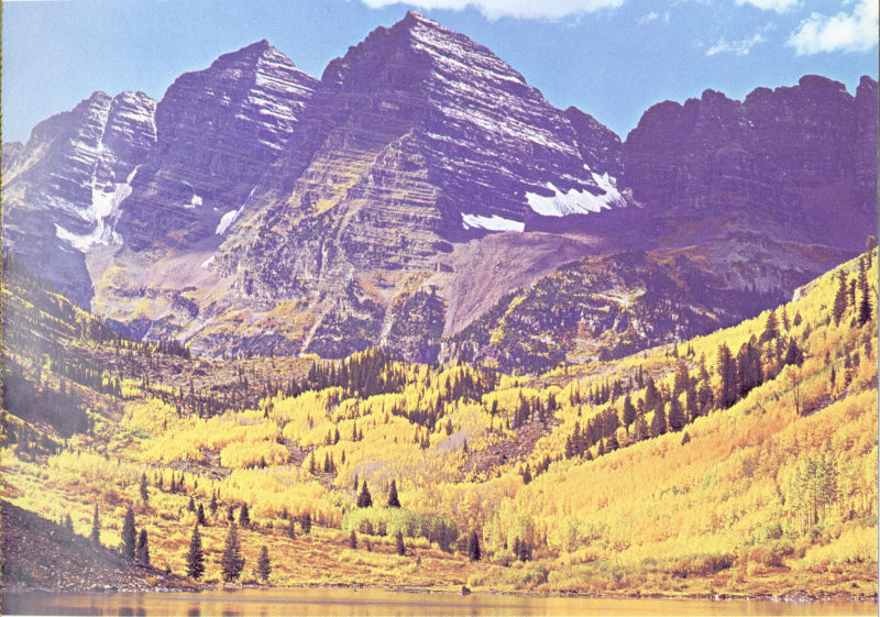Tilted dark red sedimentary rocks of the Pennsylvanian-Permian Maroon Formation are well exposed in the cliffs of Maroon Bells, southwest of Aspen. (Photo courtesy Hydraulic Unlimited Mfg. Co.)