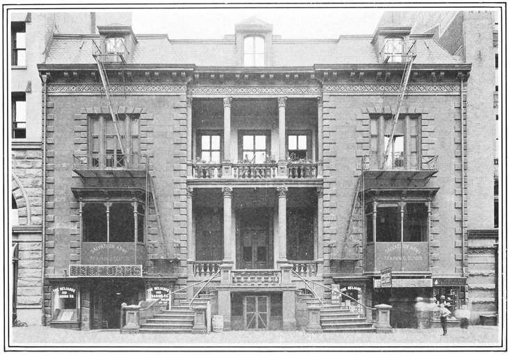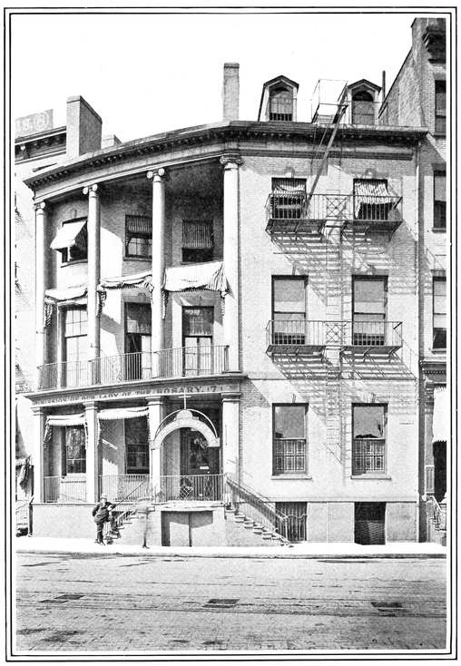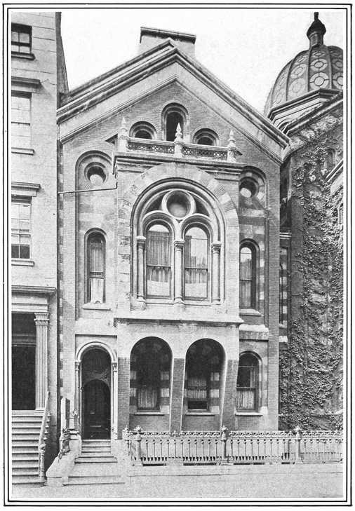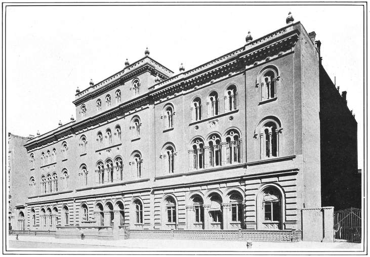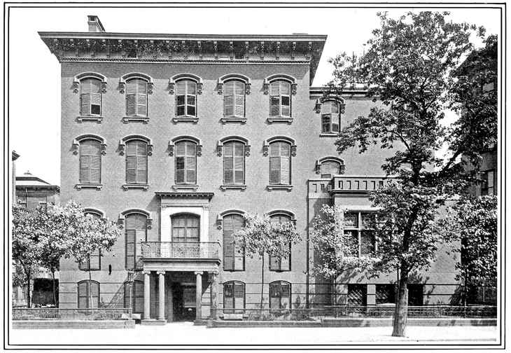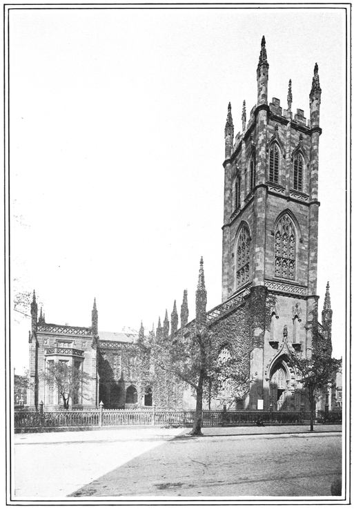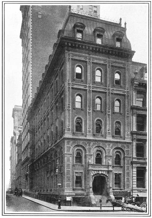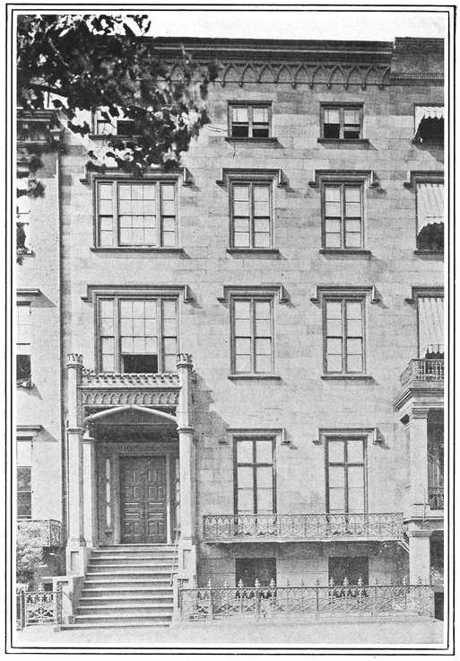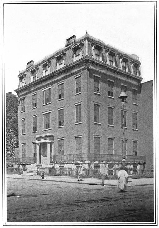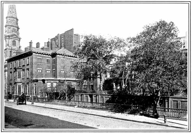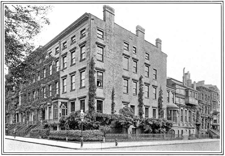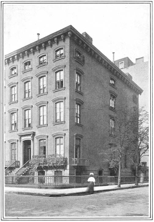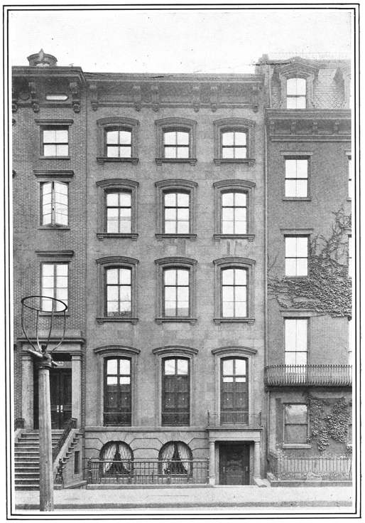 11 Among buildings that will be recalled to memory by the older citizens it would have been a satisfaction to have been able to show pictures of the Brick (Presbyterian) Church, that stood, with its yard, on Park Row, taking in the block bounded by Spruce, Nassau, and Beekman streets; or Burton’s Theater in Chambers Street; the Irving House, later Delmonico’s, on the corner of Broadway and the same street; of the old New York Hospital on Broadway near Thomas Street, standing far back with its beautiful lawn and grand old trees; of the St. Nicholas Hotel near Spring Street; of the old Coster mansion (later a Chinese museum), built of granite in the style of the Astor House, near Prince Street; and Tiffany’s place across the way, with the same Atlas upholding the clock over the door; of the Metropolitan Hotel on the next block with Niblo’s Garden; of Bleecker Street with Depau Row;3 of Bond Street with the large Ward (later Sampson) residence on the corner; the Russell residence on the corner of Great Jones Street; the famous old New York Hotel; the Lorillard mansion at Tenth Street; the large brownstone residence of Judge James Roosevelt, near Thirteenth Street, famous for the hospitality of its owners, and the red brick residence of Cornelius V. S. Roosevelt, grandfather of the President, on the corner12 of Union Square, having the entrance on Broadway.