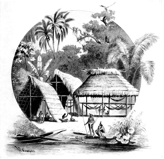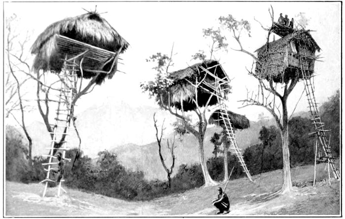 The ape-man probably knew no other shelter than nests of twigs and leaves, similar to those constructed by the orang outang and the gorilla. But with the gradual development of man’s brain and intelligence he improved these nests to 10tree-huts like those still used by certain aborigines of New Guinea, India, and Central Africa. To these huts they retreated at night, to be safe from wild beasts, and also at sudden attacks by superior enemies.