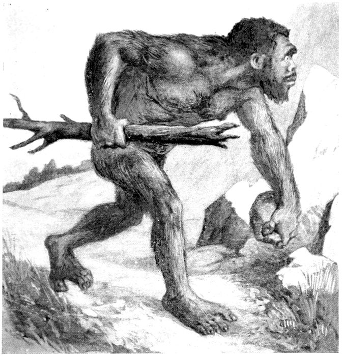 In physical appearance primeval men were far from resembling those ideal figures of Adam and Eve, pictured by mediæval artists who strove to give an idea of the glories of our lost Paradise. While these products of imagination can claim no greater authenticity than the illustrations to other fairy tales, we nevertheless owe to the diligent works of able scientists restorations of the figures of primeval men. These deserve full credit, as they are based on skeletons and bones, found in caves, which some hundred thousand years ago were inhabited by human-like beings. From such remains it appears that our predecessors were near relatives to the so-called man-apes, the orang outang, chimpanzee, gibbon, and gorilla. Ages passed before these ape-men, in the slow course of evolution, developed into man, distinctly human, though still on a far lower level than any savage people of to-day.