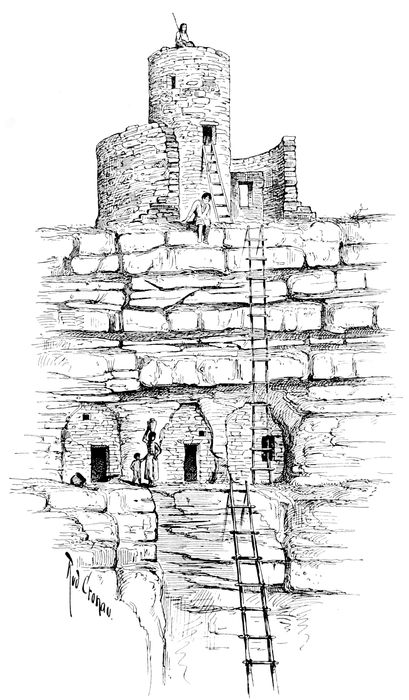 Other dwellings stand on almost unscalable boulders, or they are placed within the fissures and shallow caverns of perpendicular walls. They can be reached only by descending from the upper rim of the cañon by means of long ropes, or by climbing upwards from below by using hands as well as feet. If one succeeds in getting to these places, one finds them always provided with store rooms for food and water. Constant danger of hostile assaults must have compelled people to live in such difficult retreats, which could be prepared only at enormous expenditure of time and labor.