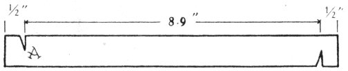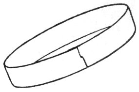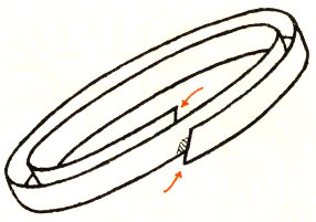 The type of core most widely used for bracelet making is formed from a strip of spring steel either ½″ or ¼″ wide. Make a narrow V-shaped slit half the width of the band at about ½″ from one end. (Fig. 2A.) Mark off beyond this cut the circumference of your bracelet (usually 8-9 inches) and make another slit half way through from the opposite side. Clip off the metal about ½″ beyond this second slit. Connect the band as shown, with the ends on the inside of the bracelet. (Figs. 3 and 4.) Set the band on a solid surface and pound with a mallet or hammer until the edges fit smoothly.
