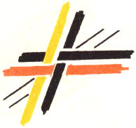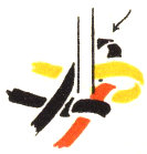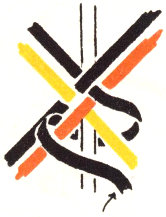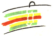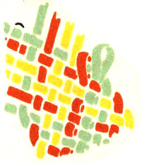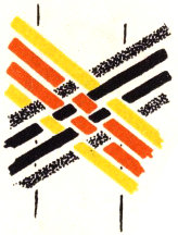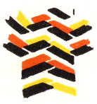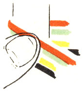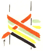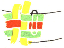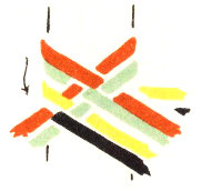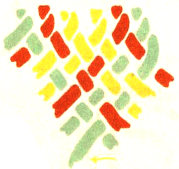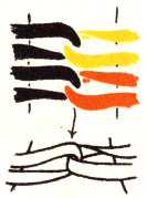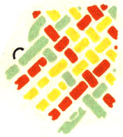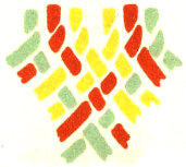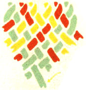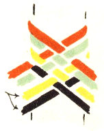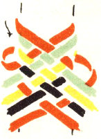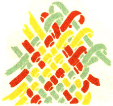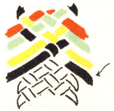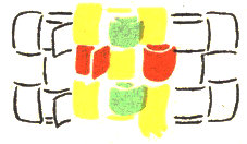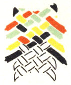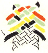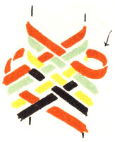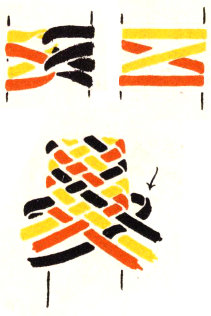 The pattern shown above is made with three colors according to the direction illustrations. Checkerboard patterns are made by using one color on the band and a second color for weaving. Four more two-color patterns are made by placing the lighter color at the center of the band or at the edge, and by using a dark or a light weaving strand. Three-color patterns have six additional possibilities for variation on the same principle.