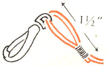 The stout core necessary for a dog leash may be made of standard core braid or of extra heavy twine. Fold one end back to make a loop 7″ long. Bind the end with wire. Put the other end through the eye of the snap, then bend it back and bind it with wire to make a loop 1½″ long. (Fig. 14.)