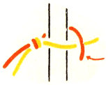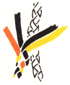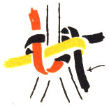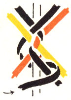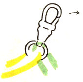 Lanyards are made in much the same way as leashes, but without the core. The snap is fastened securely so that the work can be pulled against it. Then both strands are run half way through the ring to give four equal braiding strands. Cross the strands on the ring in exactly the way shown in figure 40. This arrangement corresponds to the starting position of the leash. The braiding is done in the same way as that described for the leash, beginning with the upper right strand. (Fig. 16.)