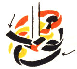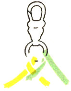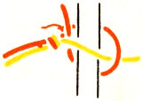 Tie the two strands of cord gimp together at one end, leaving about 1″ beyond the knot to use later for finishing. Place the knot at the left side of the core. Select the color which is to show on the band and lead it across the outside of the core. (Fig. 65.) Lead the other strand through the core, cross it over the top strand (Fig. 66), lead it back under the core and up through the loop at the left side. (Fig. 67.) This process makes half a square knot.