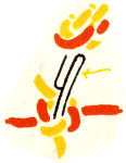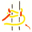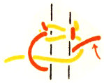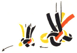 Complete the stitch by drawing all the strands tight. Continue making squares in this way until the strands are only about 2½″ long. The spiral braiding described on page 6 may be used in place of this square braiding or in combination with it.