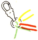 Fasten the buckle securely so that you can pull against it to keep the braiding tight. Hang three strands of gimp on each side of the tongue, so that you have twelve strands of equal length. Since the order of the strands determines the pattern, arrange the strands on the buckle as indicated for any of the patterns on page 11.