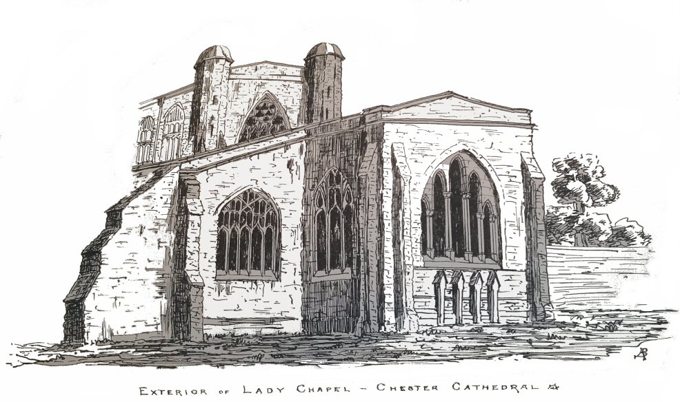 The Lady Chapel of the Cathedral of Chester has long been known to antiquarian architects as an interesting and valuable specimen of the Early English style, but it has scarcely ever been examined in detail by them, and to the general observer has presented no features of special interest. The keen and accurate judgment of Rickman discovered the general beauty of its proportions; but the destruction of all the original windows, and other disfigurements of the building, which took place when the side aisles were added in the 15th century, have served so far to obscure its beauties, that it has been supposed to possess little or nothing worthy of observation.