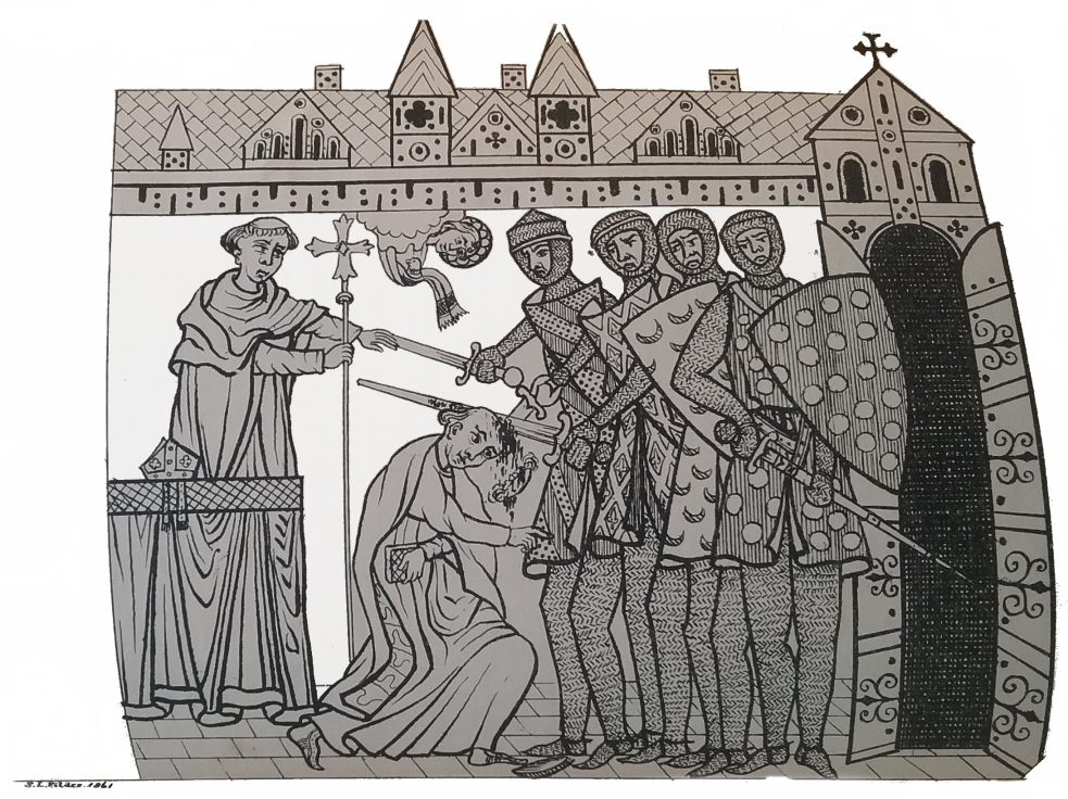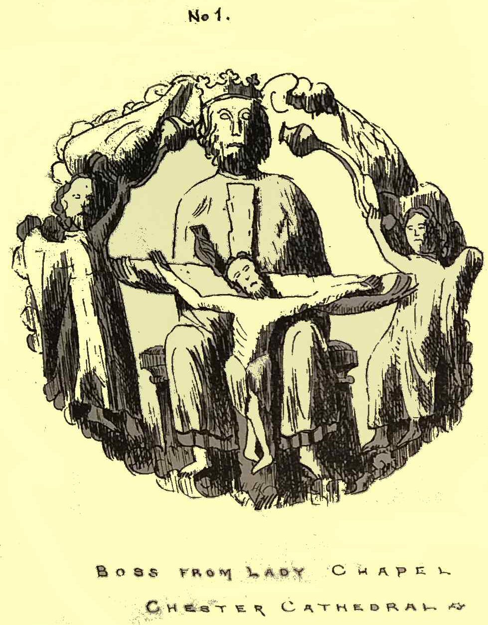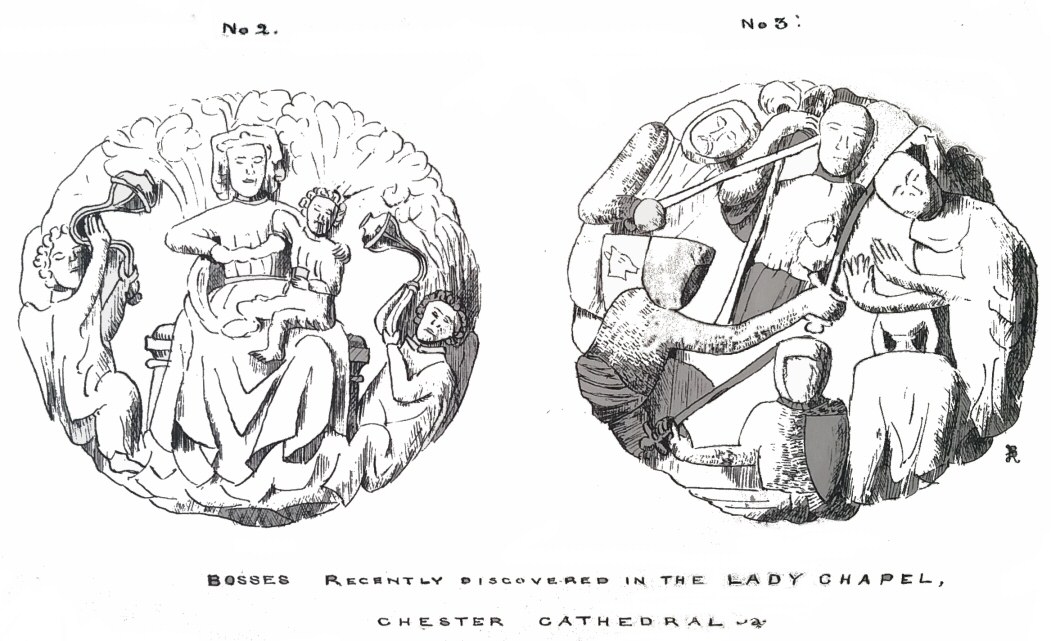 It is not uninteresting to trace out a reason for the accurate delineation of the facts of this murder upon this boss. In the celebrated translation of the body of the canonized Saint from the crypt of Canterbury Cathedral, where it had been at first buried, to the newly-erected Shrine at the east end of the choir of the same church,—which translation was made by Stephen Langton, Archbishop of Canterbury, in the presence of King Henry III. and all the Prelates of the realm, and cost, in pomp and ceremony, more than a coronation,—the Bishop of Chester of that day [11a] was a principal actor. He was joined with Langton in the Royal Commission, which bears date A.D. 1220. The Bishop would most likely bring back with him from Canterbury to Chester a vivid impression of the solemnity of the scenes, and of the virtues of the martyr. He did bring back with him a very precious relic of the Saint, no less than the girdle which he wore at the time of his martyrdom. And this girdle he presented to the Abbey of St. Werburgh, where it was preserved with religious care until the time when all such relics acquired perhaps something less than their intrinsic value, and were destroyed at the Dissolution. With the relic, the Bishop would be likely to bring with him an accurate version of the details of the murder, and this version would be embodied on the sculptured stone of this boss.