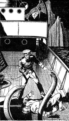 "Time the captain heard about this!" growled Hodge, "Although it ain't likely to do any good." His iron grip aroused Kort from the stupefaction of horror into which the sight of Pratt's death had plunged him. Together they went forward, giving the monsters a wide berth, past the cannery deck where most of the deck crew were gathered, to the captain's cabin.