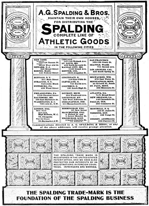 THE SPALDING TRADE MARK IS REGISTERED IN THE UNITED STATES PATENT OFFICE, AND WE HAVE ALSO PROTECTED OUR INTERESTS BY 39 REGISTRATIONS IN FOREIGN COUNTRIES. INFRINGERS ARE WARNED.