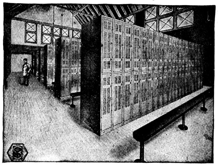 Some of the 6,000 Durand-Steel Lockers installed in the Public Gymnasiums of Chicago. 12″ × 15″ × 42″, Double Tier.
