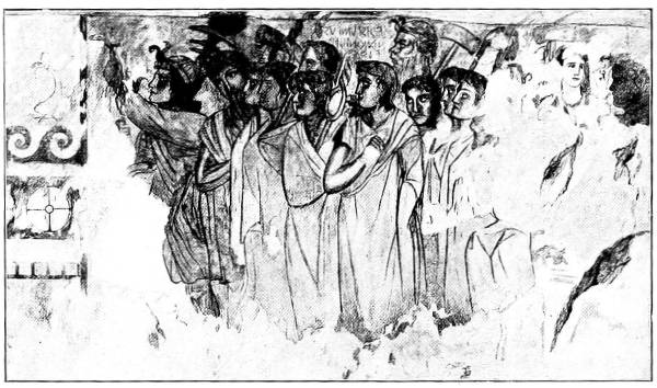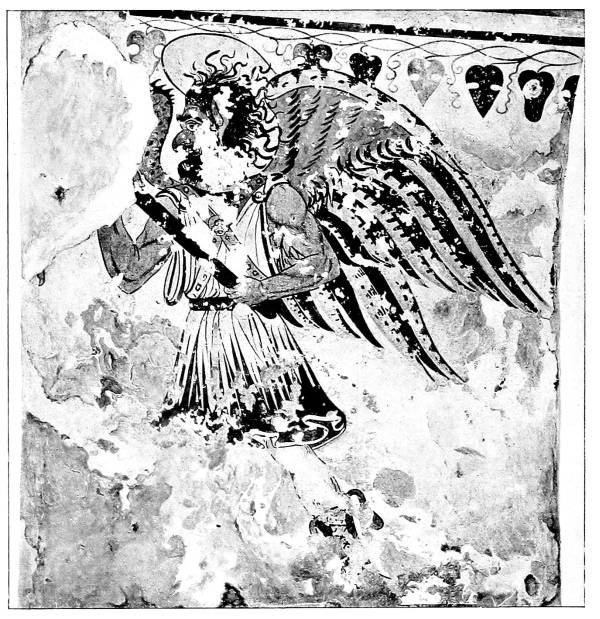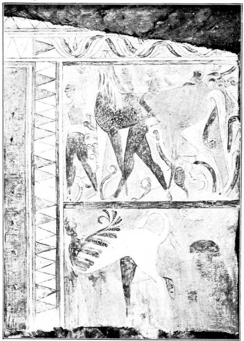 Meanwhile the first volume of the promised work of Fritz Weege (Etruskische Malerei, Halle, 1921) has appeared, copiously and splendidly illustrated. The text contains general views concerning Etruscan religion and society rather than descriptions of the paintings themselves, and I cannot refrain from saying that I find Weege’s statements and opinions, and the parallels which he adduces, too often more fanciful than convincing, in spite of the vast erudition displayed therein. I do not find anything in my own text which I feel inclined to alter after reading his book.