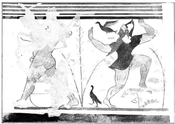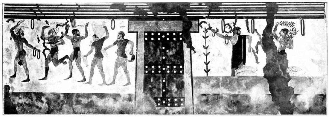 We may take the Tomba degli Auguri in Corneto, discovered in 1878, as our starting-point. There are coloured drawings as well as full-sized facsimiles of its pictures in the Helbig Museum.
