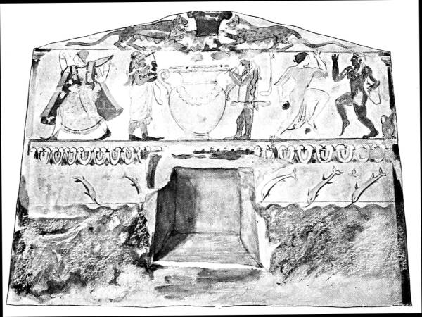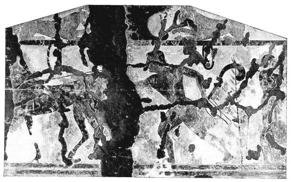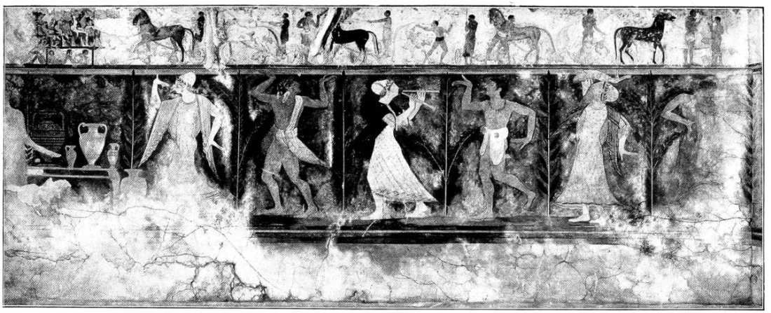 A considerable group of Etruscan tomb-paintings, dating from the middle of the sixth century, show in their composition close connexion with Ionic vase-painting, especially with the so-called Caeretan hydriae, while their main pictures tell us something about the Etruscans themselves and their conceptions of Life and Death and Eternity. Only in the animal friezes beneath the painted roof-supports does the old decorative conception of the human and animal figure still linger; elsewhere the pictures now have content and meaning.