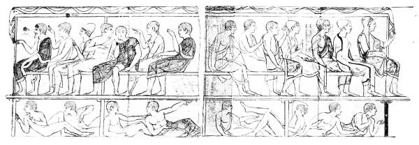 49 Athenaeus i. 23 d. On the Etruscan custom of reclining at table, like the Greeks, and unlike the men of the Homeric age and later the Macedonians, who sat, see Athenaeus i. 17 f, 18 a.