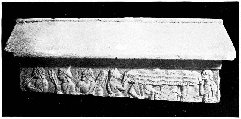 114 Trumpets at Roman funeral processions are known from reliefs on sarcophagi. Röm. Mitt. xxxiii. 1908, pl. iv (pp. 18-25), and Cagnat and Chabot, Manuel d’Archéol. Romaine, p. 586, fig. 315. Notice in the second relief from Amiternum, Röm. Mitt. 1908, pl. iv, at the bottom, how the banquet with the members of the family reclining on festive couches is also preserved in early Rome (second to first century B.C.).