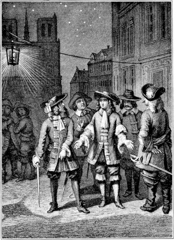 Returning late one evening from some gathering wearing a sword, as French custom demanded, his way was suddenly stopped by a masked man who ordered him to draw his sword, demanding satisfaction for an injury. In vain Penn protested his innocence of any offence and his ignorance even of the identity of his accuser, but the latter insisted that he should fight, declaring Penn had insulted him by not returning his greeting. The discussion soon attracted a number of auditors, and under penalty of being dubbed a coward by refusing to cross swords with his adversary, Penn was obliged to yield. But if, as is not unlikely, the whole affair was planned by his comrades to force him to use arms, a practice forbidden among the Quakers, the youth who undertook the role of challenger was playing rather a dangerous game; for among his other acquirements Penn had thoroughly mastered the art of fencing and quickly succeeded in disarming his adversary. Instead of pursuing his advantage, however, as the laws of duelling permitted, the spectators were astonished to see him return the rapier with a courtly bow to his discomfited foe and silently withdraw. He might yield to the prevailing custom so far as to draw his sword, but his conscience would not permit him to shed human blood.