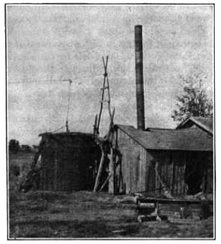 The volatile oil obtained from many aromatic plants by steam distillation is often their most valuable product. The equipment necessary for distilling volatile oils consists essentially of a steam boiler, a retort, and a condenser. A constant supply of cold water must also be available. A common type of retort consists of a circular wooden « 10 » vat, about 6 feet in diameter and 8 to 10 feet deep (fig. 4), fitted with a removable cover, which can be made steam tight. Metal retorts made of boiler iron three-sixteenths of an inch thick and jacketed with wood to prevent the radiation of heat are also used. A pipe leads from the steam boiler to the bottom of the retort and another from the top of the retort to the condenser, one form of which consists of a coil of tin-lined or galvanized-iron pipe inclosed in a jacket through which cold water is kept flowing when the still is in operation.