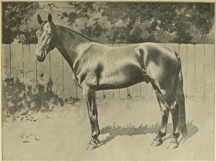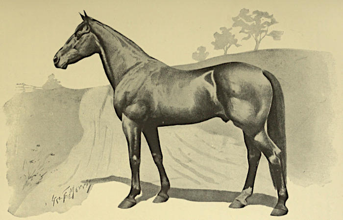 The Monthly was from the first illustrated, and the progress in horse art is well demonstrated by tracing through its pages. Its first drawings were made by James C. Beard, who came of a race of artists, but whose attempts at horse portraits were wretched caricatures, one and all. Still, they seemed to be the best, or rather the least bad, then obtainable. Mr. Wallace, however, was painfully cognizant of the lack of truthful portraits of horses, and was not less delighted than surprised when, one September day in 1878, a young man came into his office, and exhibited drawings that were so obviously truthful portraitures that they were a revelation in horse art. A rapid questioning as to whether he had drawn them, and where he had hidden his light so long, developed that the young genius was Herbert S. Kittredge, of Pennsylvania. He was immediately engaged, and his work in the Monthly was the first reputable horse portraiture in American literature. This gifted, self-educated genius died in May, 1881, long before his prime, and when his powers were daily developing. He was the forerunner of Whitney, Dickey, Morris, and others whose ability to faithfully portray horses is acknowledged to-day. He had not the mechanical aids—notably the camera—or processes which they so freely call into play, but in true artistic ability to draw faithfully, it is doubtful whether this undeveloped master was the inferior of any artist who has yet made horse portraiture a specialty in any country.