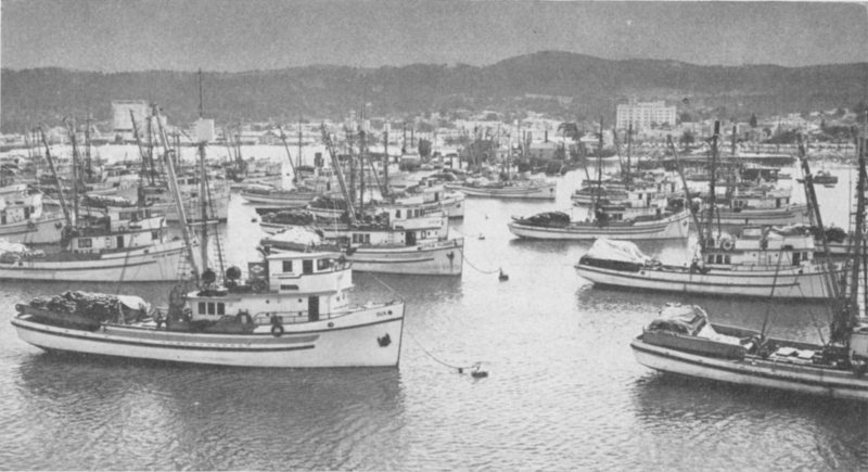 Pleasure craft by scores find anchorage beside Santa Cruz’ Municipal Wharf, where also fishing vessels moor and many an angler drops a line.