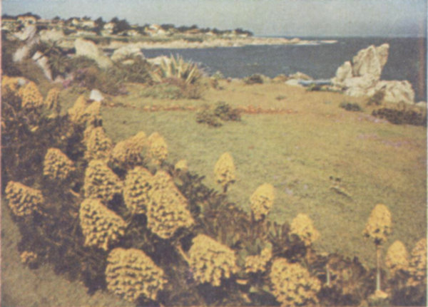 In the nearby mountains are the permanent convention sites of several religious groups, one of which includes 5 a building capable of seating 5,000 persons. These and other conventions rank virtually as an industry in Santa Cruz’ economy. But Santa Cruz is more than a resort or convention city. It is a city of flowers. The Spanish Garden at its city hall is beautiful. The drive north along the ocean front takes the visitor past bluffs which are ablaze with colorful succulents and flowers. In season, whole hillsides south of the city flame with yellow bush lupine. Some of these plants have trunks as thick through as a man’s leg.