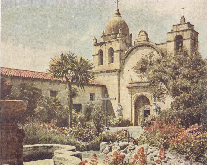 It was in what is now the city of Monterey that Portola, first governor of California, and Father Junipero Serra landed in 1770. Under an oak tree near the shore the good father held a service and founded a mission. A stone cross today marks the spot, though the mission was soon removed to its present site at the mouth of the Carmel Valley to be away from the presidio, or military post, which Portola set up. At this mission Father Serra made his headquarters and from it he supervised the building of the mission chain.