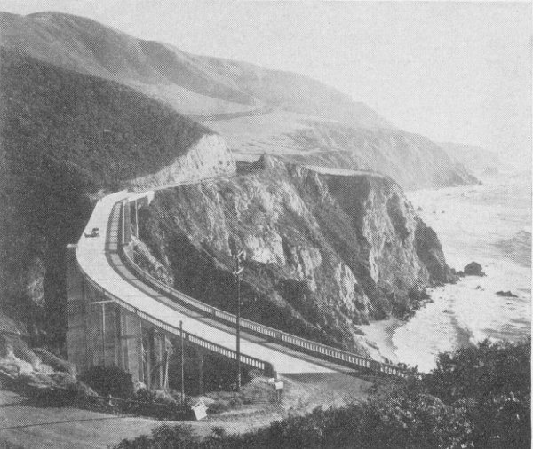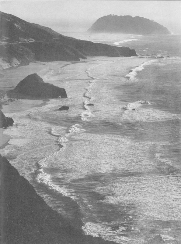In the north is Santa Cruz, with its famous beach and lovely gardens, and backed by the Santa Cruz Mountains with their redwoods. Southward are historic old Monterey and Carmel, the art colony which has now become a Mecca for sight-seers and vacationists. South, again, extends a road between the mountains and the sea which is one of California’s scenic marvels.