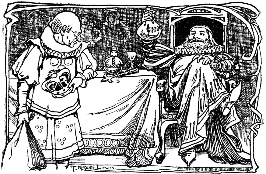 When the King’s pockets were empty, and the treasury chest and mint were also empty, the only thing His Majesty could do was to increase the taxes. This he did on an average about every other fortnight, and the consequence was that his thrifty, hard-working people had to give all their money to pay the King’s debts. This the people did not in the least like doing, and the King was very unpopular indeed; in fact, matters went to such a pitch that his subjects 7would not bow to him when they met him in the streets of his capital.