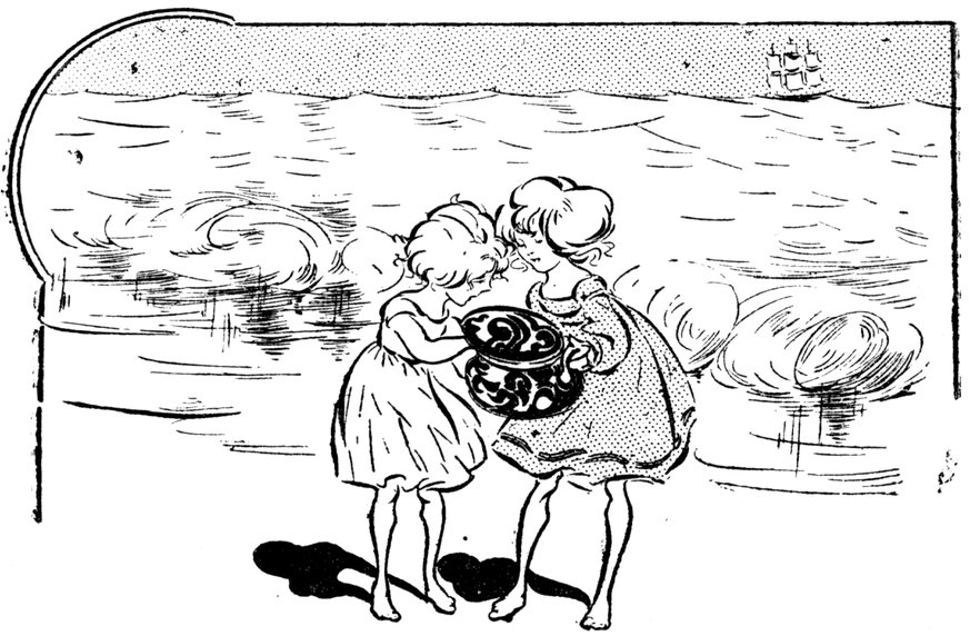 “I wonder,” said Etty suddenly, looking up into her sister’s face, “I wonder where that little pink fish is, that we found last year.” Wonder, indeed they would have wondered, if they could have seen the little pink fish at that moment. The Red Mullet, no longer a Red Mullet, but a beautiful mermaid, was under the waves only a few yards from the two children. In her hands she carried a strange-looking casket, which she brought nearer and nearer to the shore; then she gave it in charge of a friendly wave that washed it almost to the children’s naked feet.
