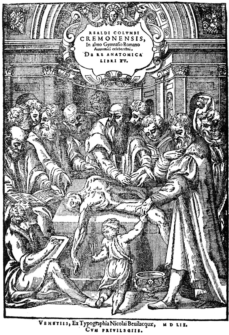 The first anatomical treatise containing an account of the lesser, or pulmonary circulation, was the monumental work, De Re Anatomica, libri xv., written by Realdus Columbus and sumptuously published at Venice in the year 1559. This, however, was not the first printed account of the lesser circulation. Six years prior to the publication of the book of Columbus, the unfortunate Servetus, in a theological treatise, described correctly the 119 course of the blood in its transit through the lungs. Tried for heresy, Servetus was burned, together with all obtainable copies of his book. Although it had been printed, the work was suppressed; hence it follows that Columbus was the first to publish the great discovery. Of the life of this anatomist we know but little. Born at Cremona, a small Milanese village, the year of his birth is unknown. He died in 1559, while his book was being printed. A few copies were finished before his demise, since a copy belonging to the late Dr. George Jackson Fisher, of Sing Sing, N.Y., contains the author’s own dedication to Pope Paul IV., while in other exemplars, the dedication has been written by the two sons of Columbus, and is addressed to “Pio IIII., Pont. Max”. This prelate, on the death of Paul IV., on August 18, 1559, became the head of the Church.